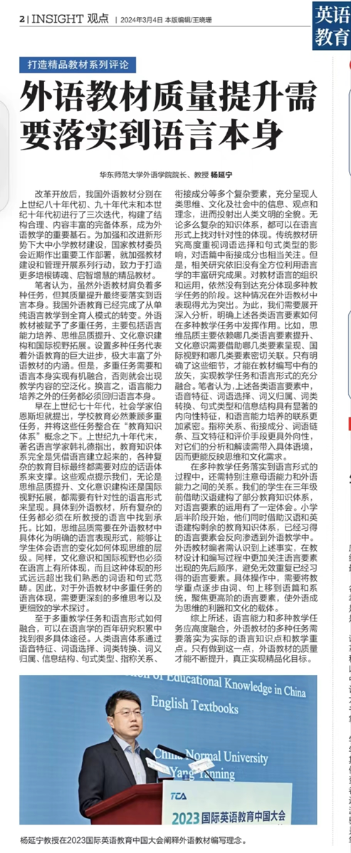 近日,番茄小说 院长杨延宁在《21世纪英文报》英语教育板块发表提升教材质量系列评论——《外语教材质量提升需要落实到语言本身》。