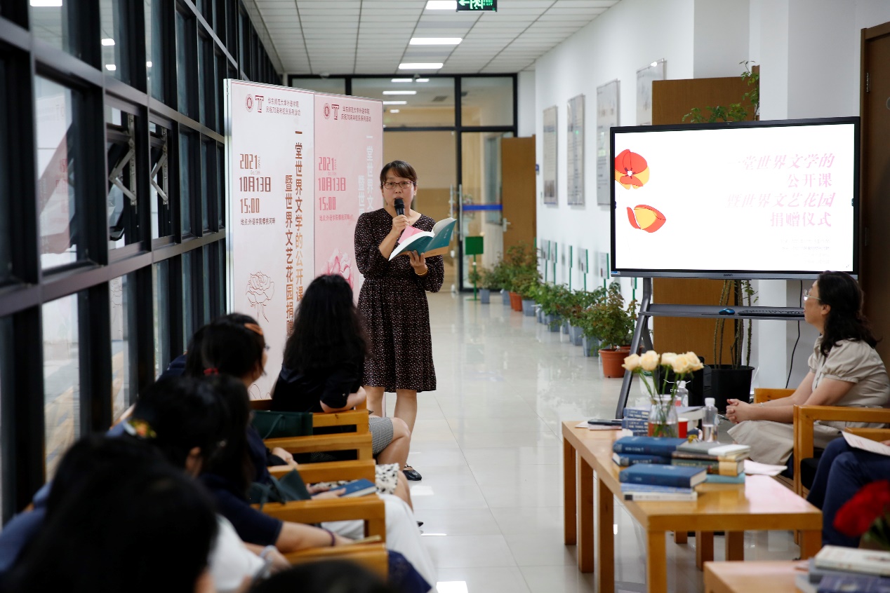在开园和捐赠仪式结束后,番茄小说 青年教师用双语朗诵了外国文学中的名篇。法语系毕笑老师朗读了《包法利夫人》的原文选段及周克希先生的译文,俄语系班婕老师选取了大家耳熟能详的《安娜·卡列宁娜》的开篇和王智量先生的译文,英语系姚晓玲老师分享了《老人与海》的片段和黄源深先生的译文。
