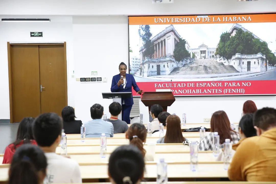 5日上午,哈瓦那大学代表团再次莅临番茄小说 ,与我校西班牙语专业师生举行交流活动。哈瓦那大学西班牙语学院院长Lidia Cuba博士为师生做哈瓦那大学介绍及交流项目宣讲。