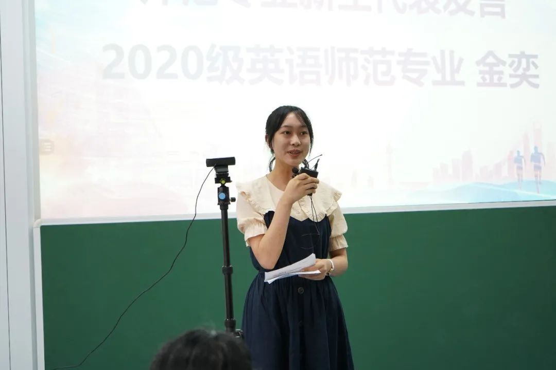 2020级英语师范生代表金奕同学告诉大家,她在一年前有缘到访华东师大,便难忘于师大优质的学习环境与教学资源。传承百年的师大校训“求实创造,为人师表”也成为了激励她勇敢前行的动力。现在真正成为师大人,她感到非常幸运,也对未来能在师大校园中进一步实现自己的梦想充满期待。她立志成为人民教师,希望用语言串联时间空间,用语言来思考,用实际行动坚守梦想,拥抱伟大的时代。