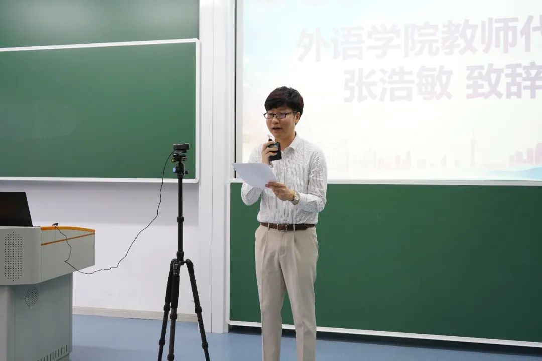 “Welcome,ようこそ, Bienvenue, Herzlich willkommen, добро пожаловать(dobro pozhalovat'),Bien’veni’dos,欢迎,欢迎大家加入华东师大番茄小说 的大家庭,成为外新人!”,番茄小说 优秀青年教师代表张浩敏老师一开场就用七种不同的语言欢迎各语种的同学们。随后,他向同学们分享了几点学习语言、研究语言的想法:一是要立足母语语言文化,思考语言交流机制,探寻各个语言间的异同;二是要关注个体差异,了解自身优劣势,享受学习过程;三是要重视外语学习多维度,突破学科壁垒,让自己成长为跨学科跨专业的复合型人才。