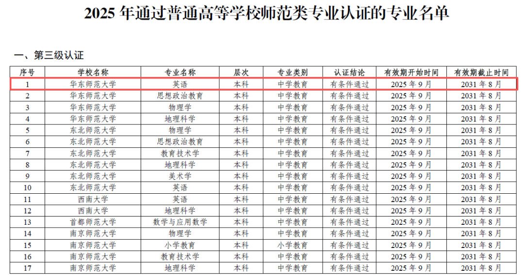 近日,教育部办公厅下发《关于公布2025年通过普通高等学校师范类专业认证专业名单及中期审核专业名单的通知》。通知中提到: